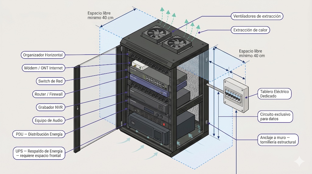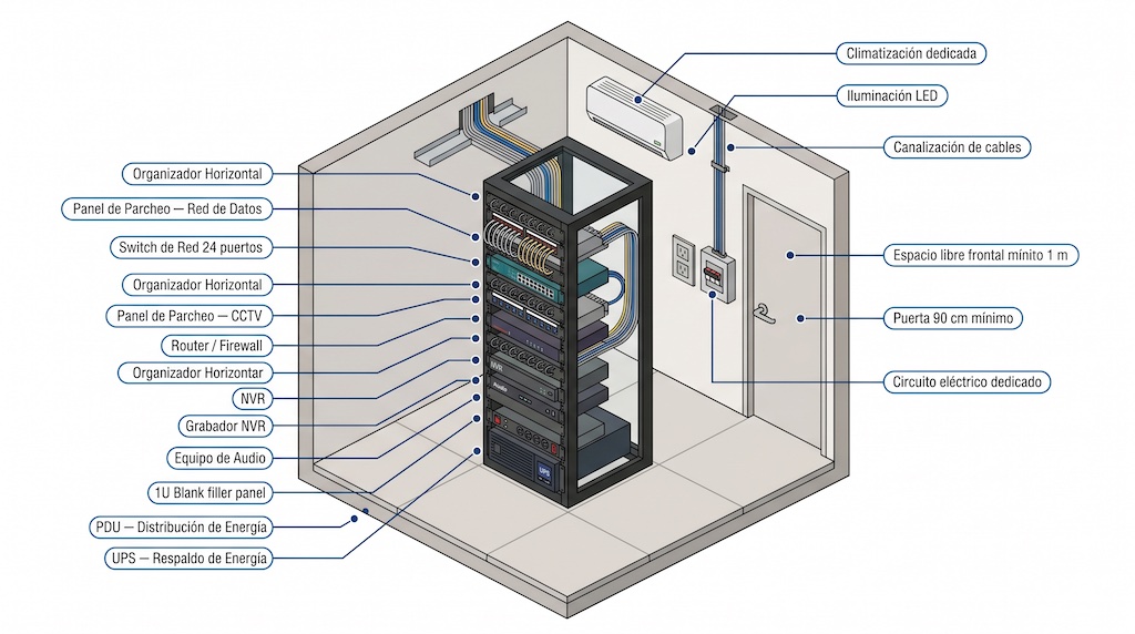 Todo sistema de Voz y Datos necesita un punto de centralización. En la industria se llama cuarto de telecomunicaciones, MDF (Main Distribution Frame), se le puede conocer como “SITE” o simplemente el cuarto de datos. Es el equivalente al tablero eléctrico — pero para internet, Wi-Fi, cámaras y en residencial también se suele usar para Audio.