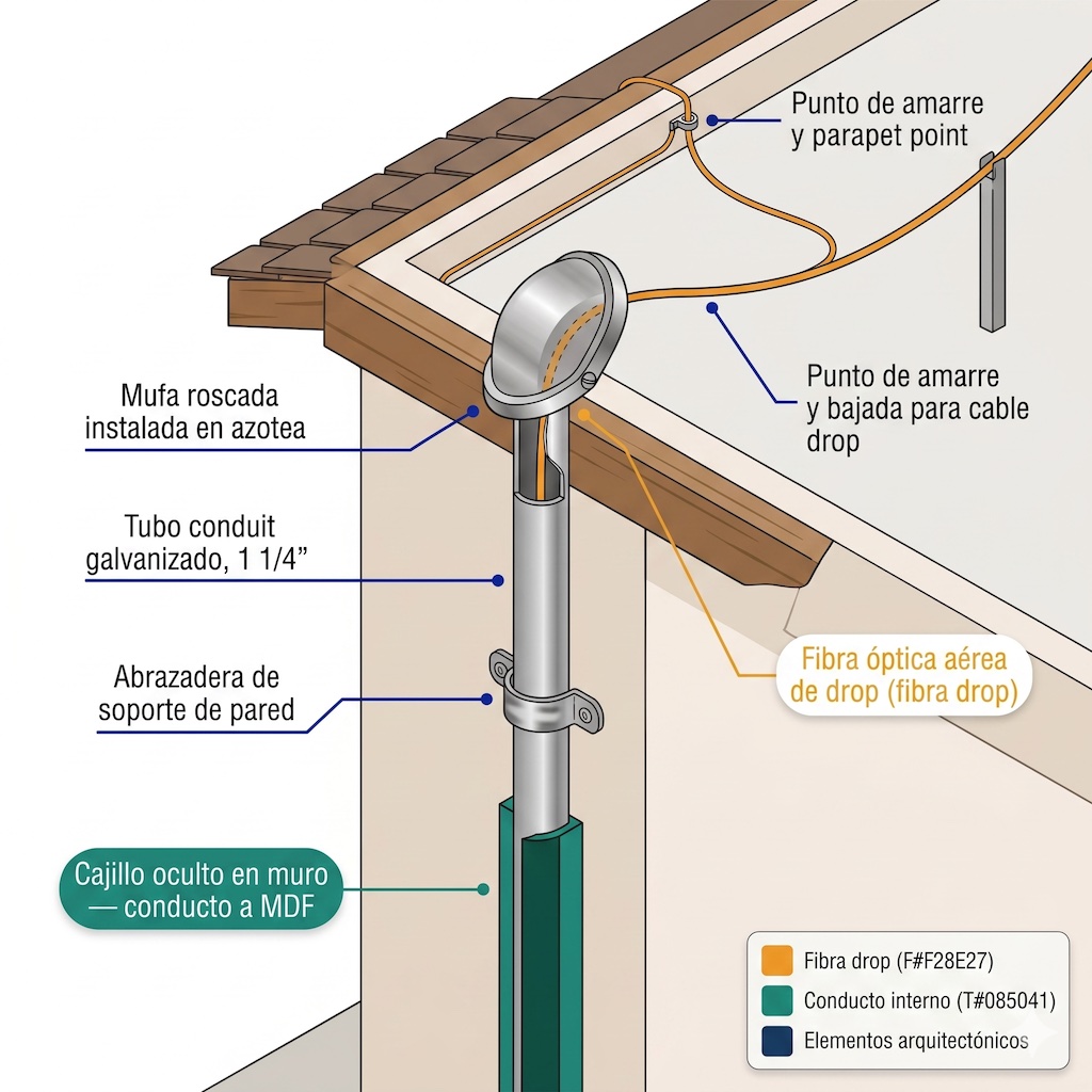 Derivación hacia azotea. Prever una salida hacia el techo con tubería hoy en día también le da la posibilidad a los clientes de agregar en el futuro un internet satelital (Starlink u otro) sin romper losa o hacer improvisaciones de mala calidad.